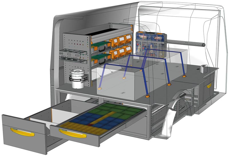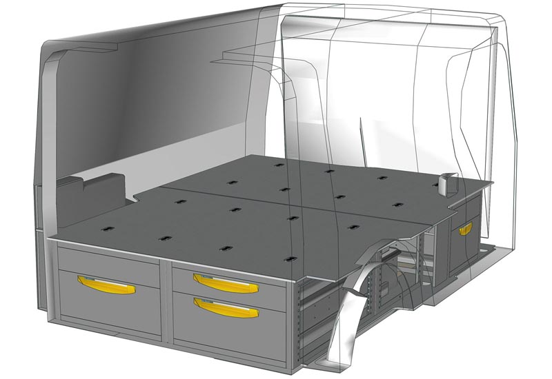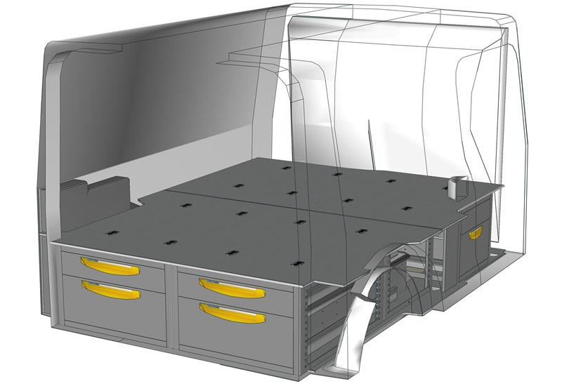 Przykłady regałów do samochodów dostawczych Floor UP, do Citan L2 H1 – h. 250 mm