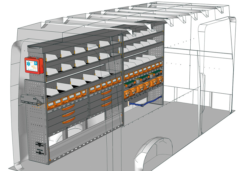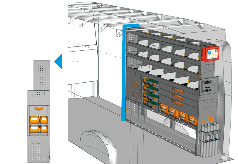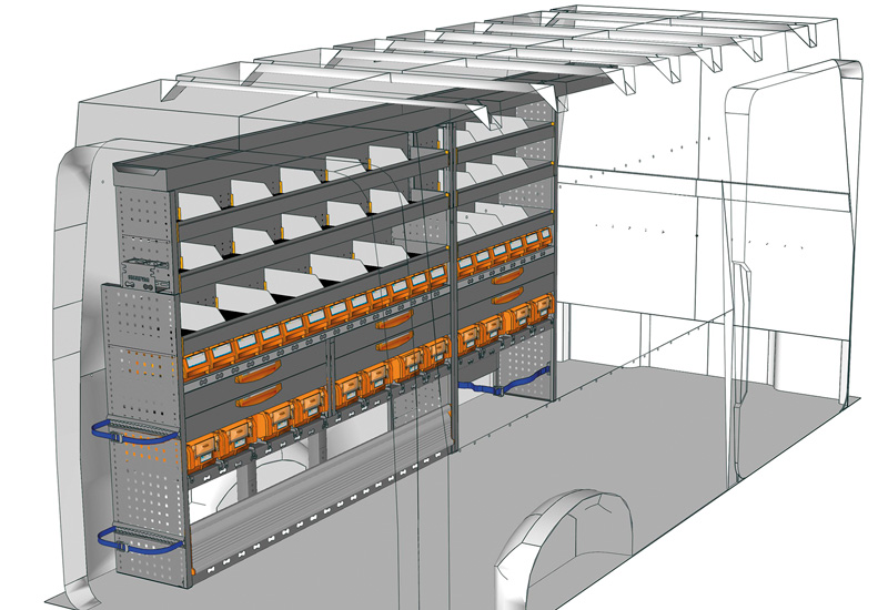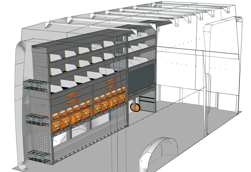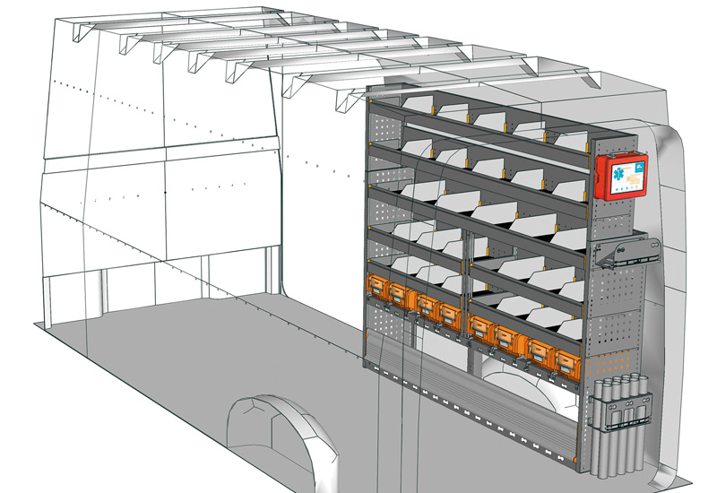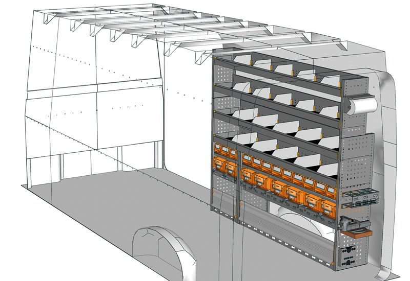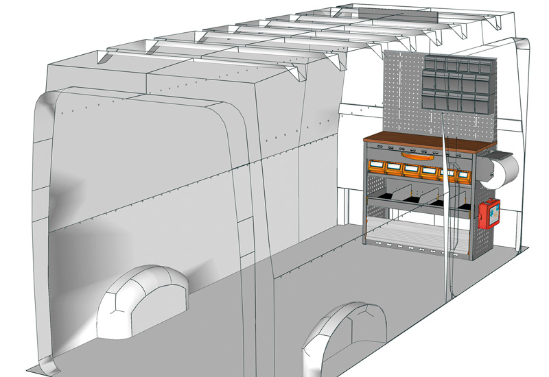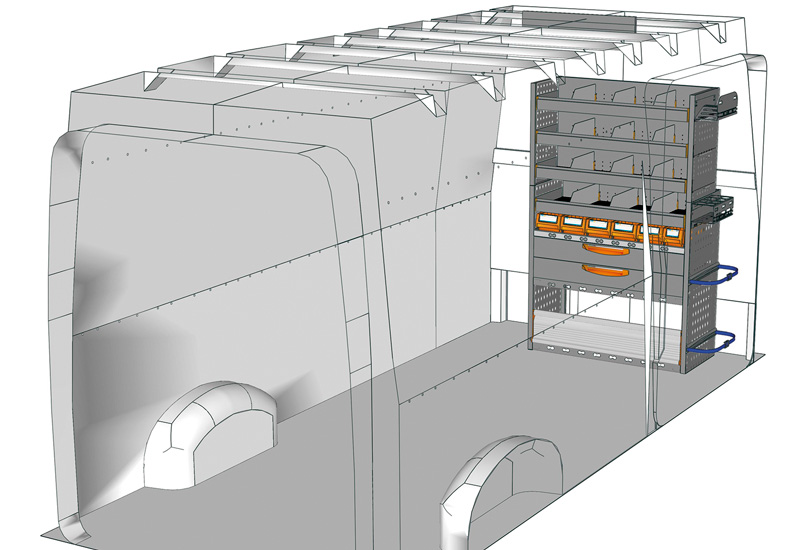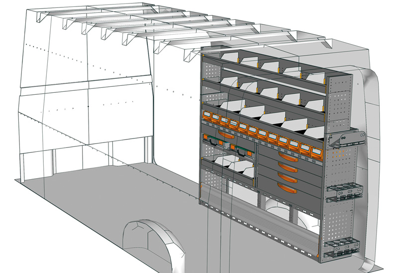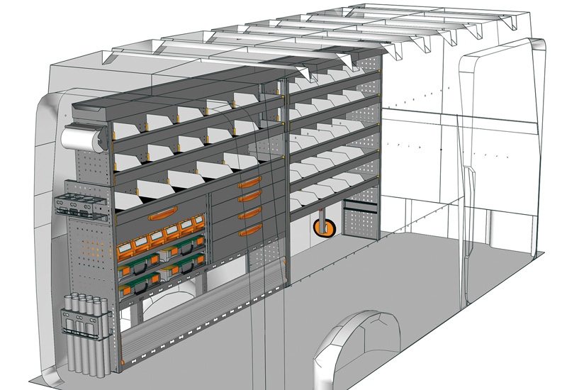 Zabudowa do Crafter L4 H3. Przedstawiamy tutaj przykłady wyposażenia do samochodów dostawczych Volkswagen Crafter (Rozstaw osi 4490 mm).