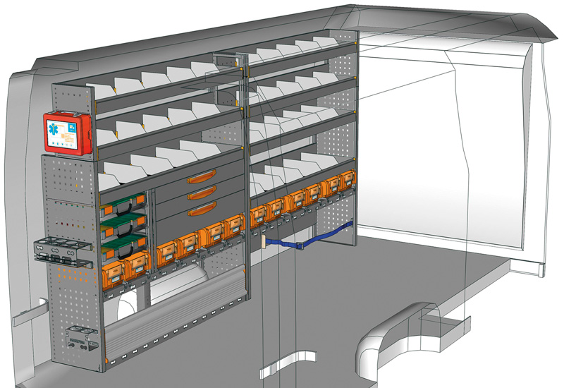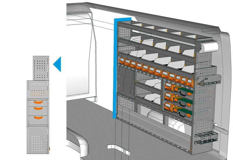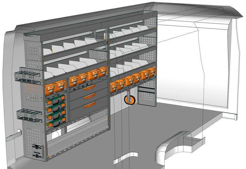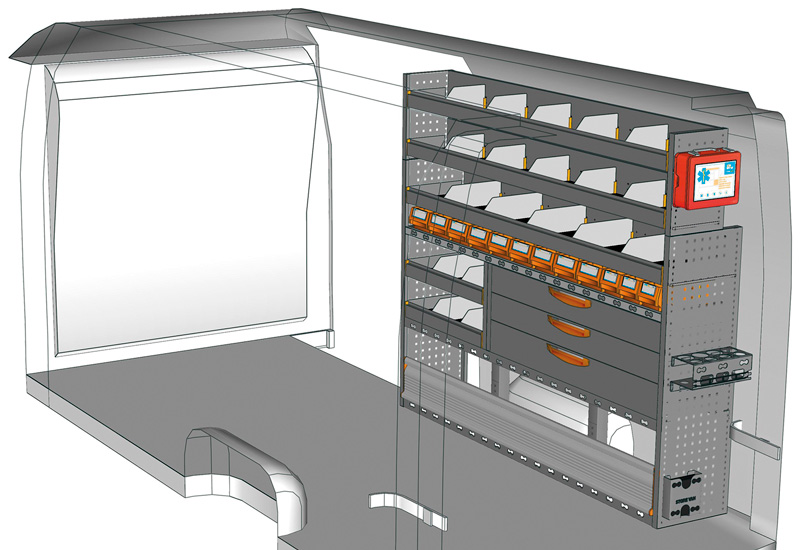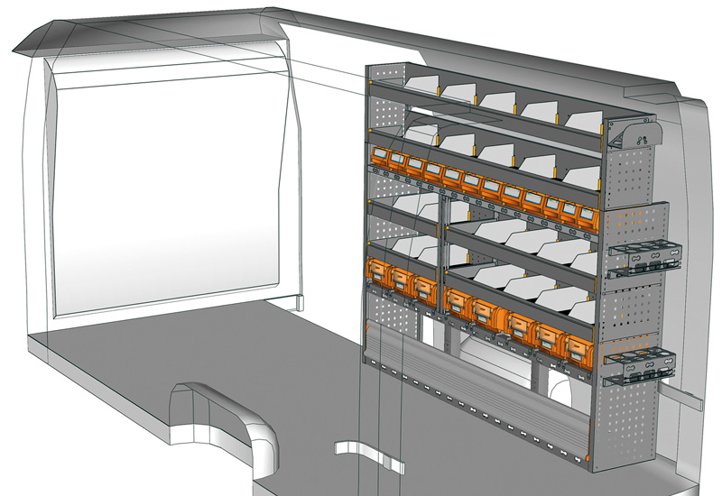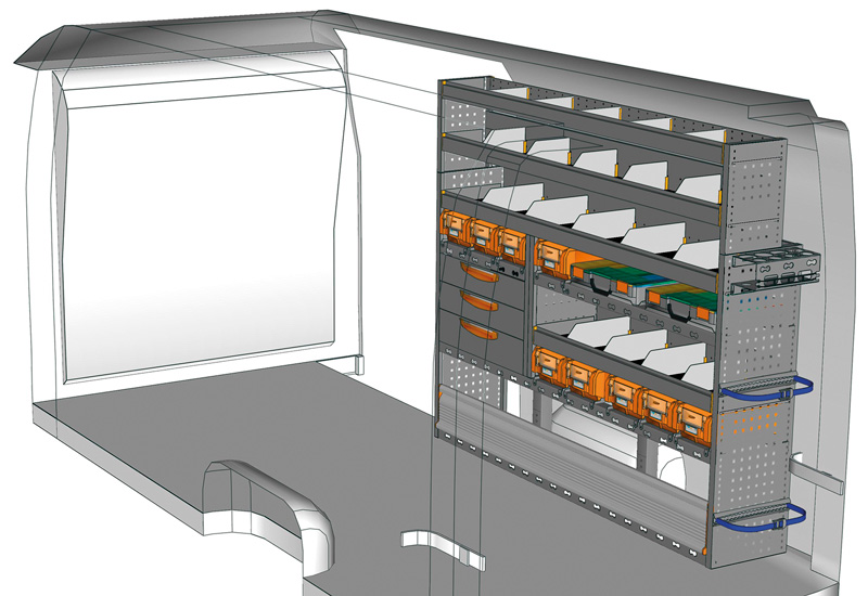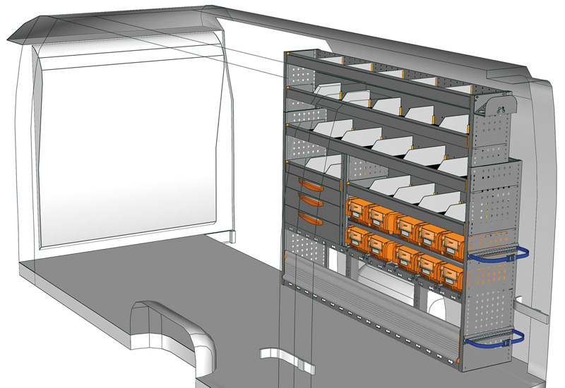 Przykłady regałów do samochodów dostawczych Safety, do MOVANO L3 H2 / H3 – Napęd na tył