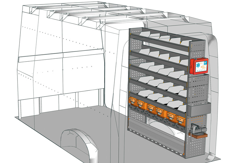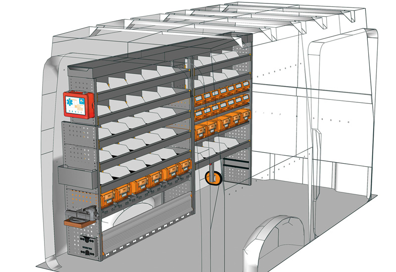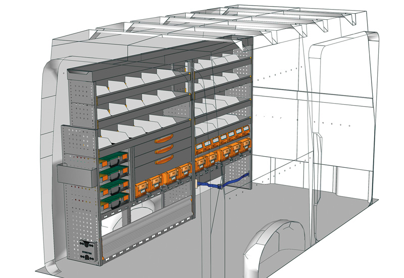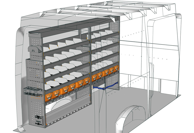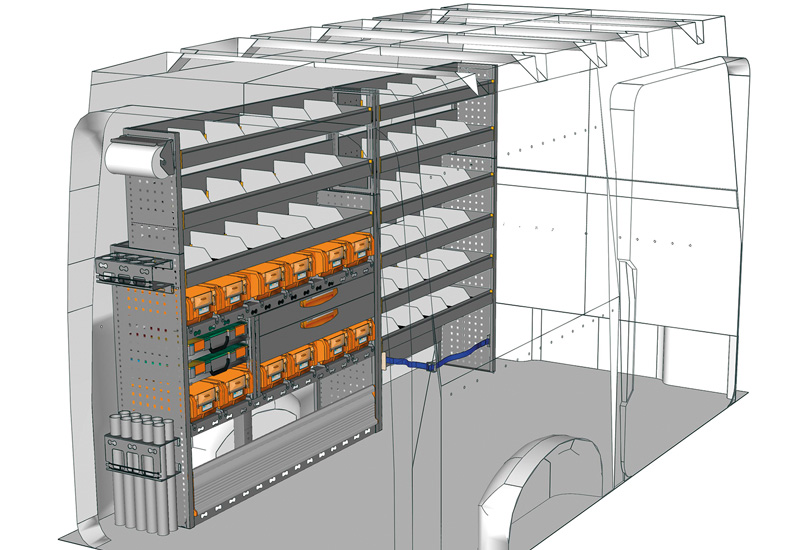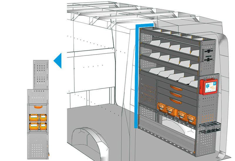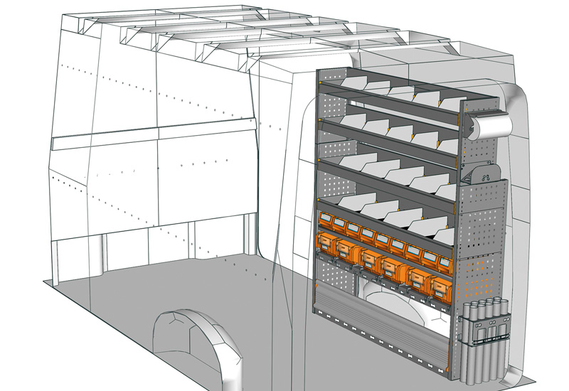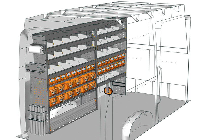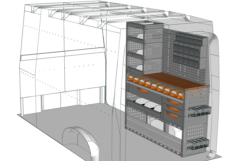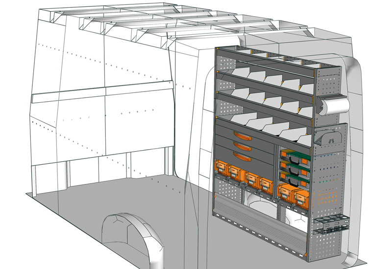Zabudowa do TGE Standard, Dach wysoki. Przedstawiamy tutaj przykłady wyposażenia do samochodów dostawczych MAN TGE (Rozstaw osi 3640 mm).