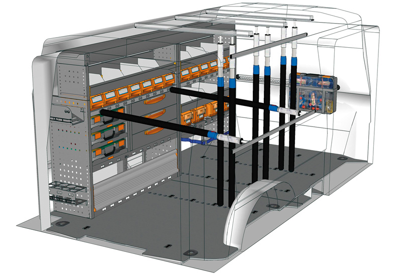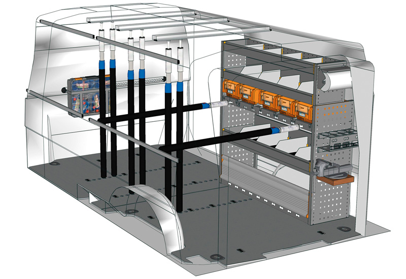 Wyposazanie samochodow dostawczych do Transporter L2 H1 Długi, Niski / Średni Dach. Przedstawiamy tutaj przykłady wyposażenia do samochodów dostawczych Volkswagen Transporter (Rozstaw osi 3400 mm).